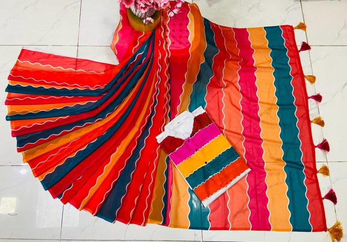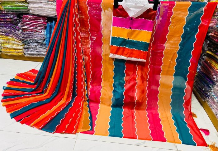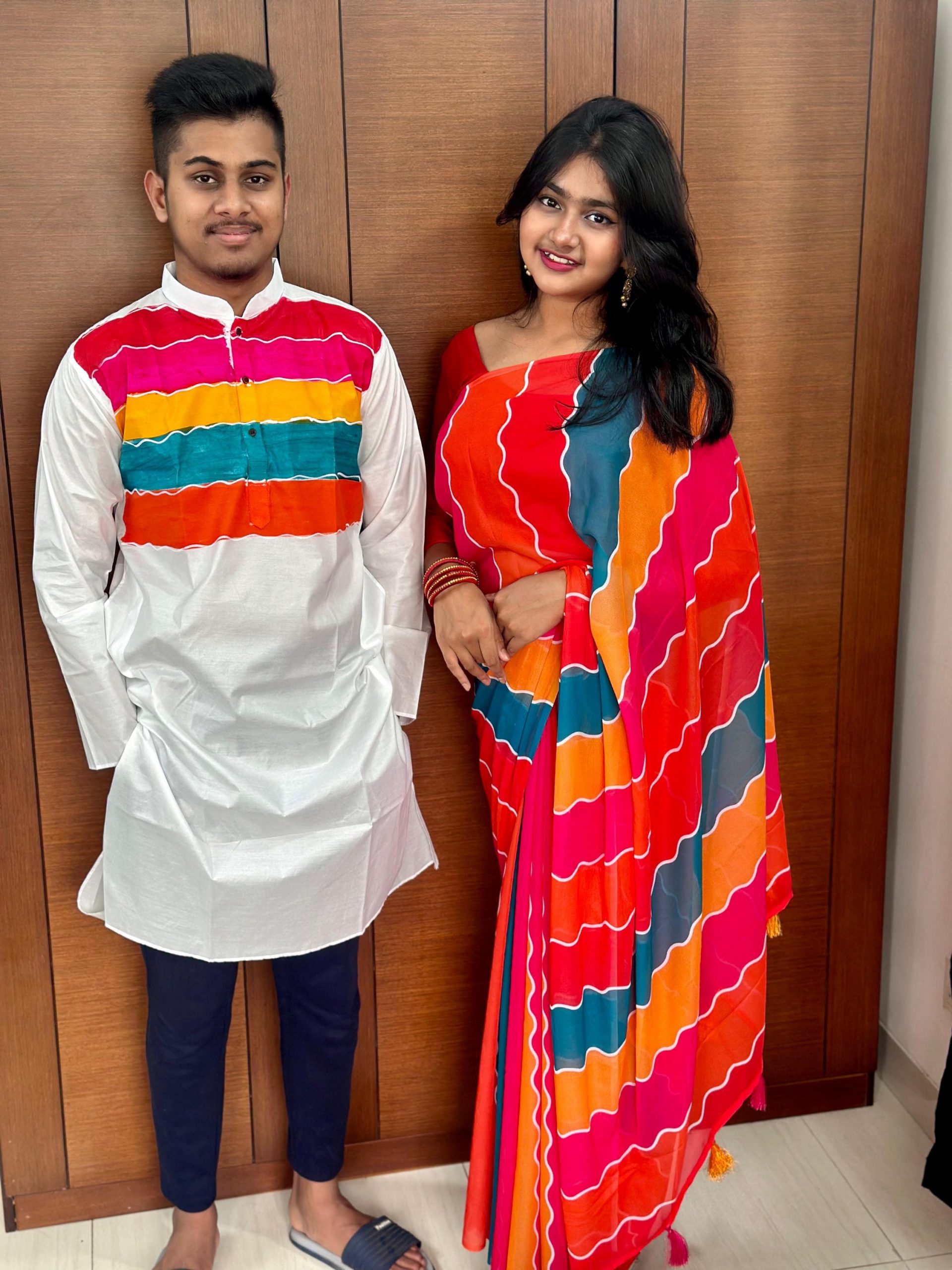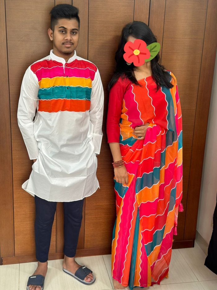 জর্জেট শাড়িতে এমব্রয়ডারি কাজ করা হযরত শরিফ এমব্রয়ডারি কাজ করা ও ধুপিয়ানসিল্ক পানজাবি তে হ্যান্ডপ্রিন্ট কাজ করা।।।