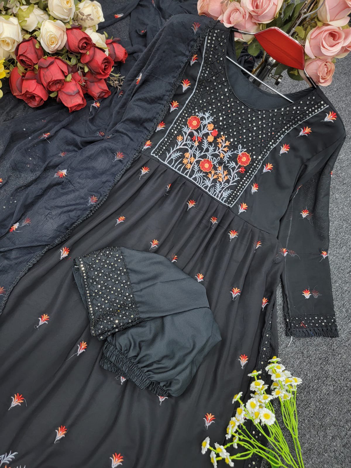কামিজ:- পিউর জর্জেট কাপড়ের উপর গর্জিয়াস কম্পিউটার এমব্রয়ডারি+সিকোয়েন্সের কাজ করা থাকবে । বডি সাইজ ৩৮/৪০/৪২/৪৪..লং :৪৭/৪৮ ইঞ্চি …
